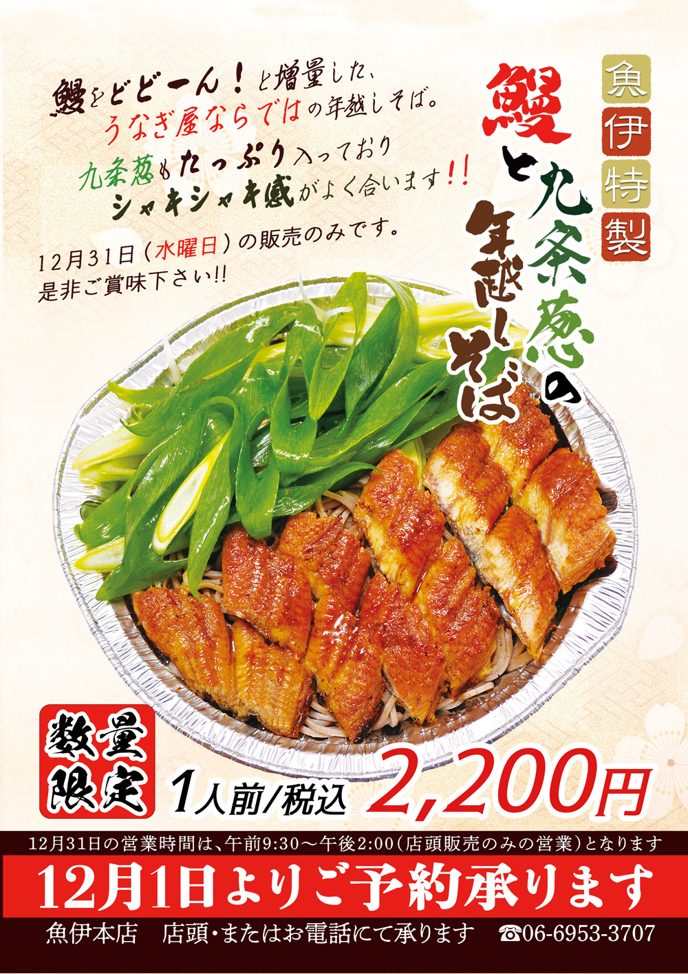 また、今年も本店限定の人気商品「鰻と九条葱の年越しそば」を