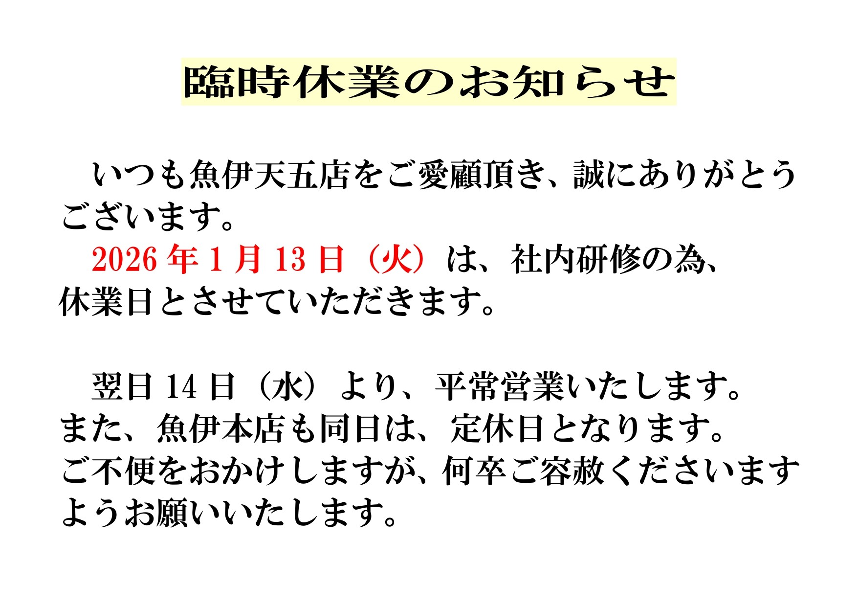 <2026年1/13>魚伊天五店、臨時休業のお知らせ。